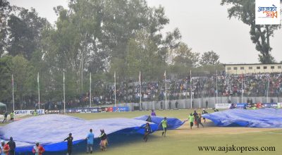 नेपाल र यूएईबीचको अन्तिम खेल वर्षाका कारण खेल अवरुद्ध भएको छ । त्यस्तै मैदानमा वर्षा भएका कारण कभरहरु ओछ्याइएको छ