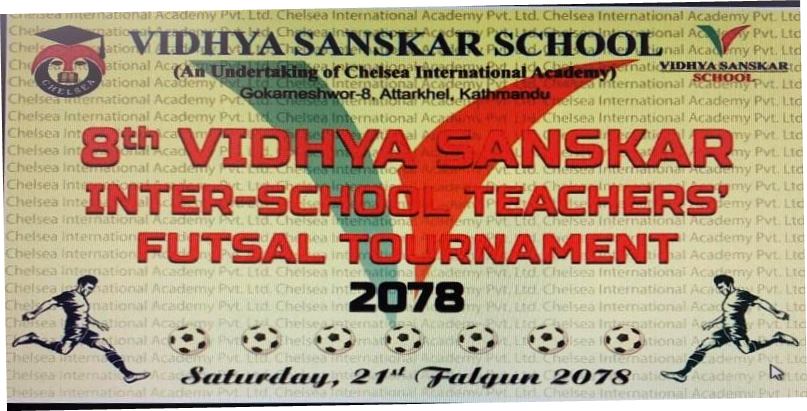 काठमाण्डौं, १४ फागुन । गोकर्णेश्वर नगरपालिका ८, जोरपाटी अत्तरखेलस्थित चेल्सी इन्टरनेशनल फाउण्डेशन अन्तर्गत विद्या संस्कार स्कुलको खेलकूद विभागको आयोजनामा यही फागुन २१ गते शनिबार आठौं चरणको विद्या संस्कार अन्तर विद्यालय शिक्षक फूटसल प्रतियेगिता २०७८ सञ्चालन हुने भएको छ ।