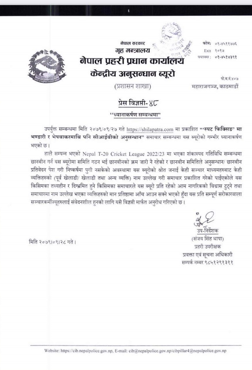 हालै सम्पन्न नेपाल टी२० क्रिकेट लिगमा स्पट फिक्सिङसँग सम्बन्धित समाचारमा नेपाल प्रहरी प्रधान कार्यालय केन्द्रीय अनुसन्धान ब्यूरो (सिआइबी)लाई उदृद्ध गर्दे विभिन्न सञ्चारमाध्यमले समाचार लेखेकोमा गम्भीर ध्यानाकर्षण भएको जनाएको छ ।