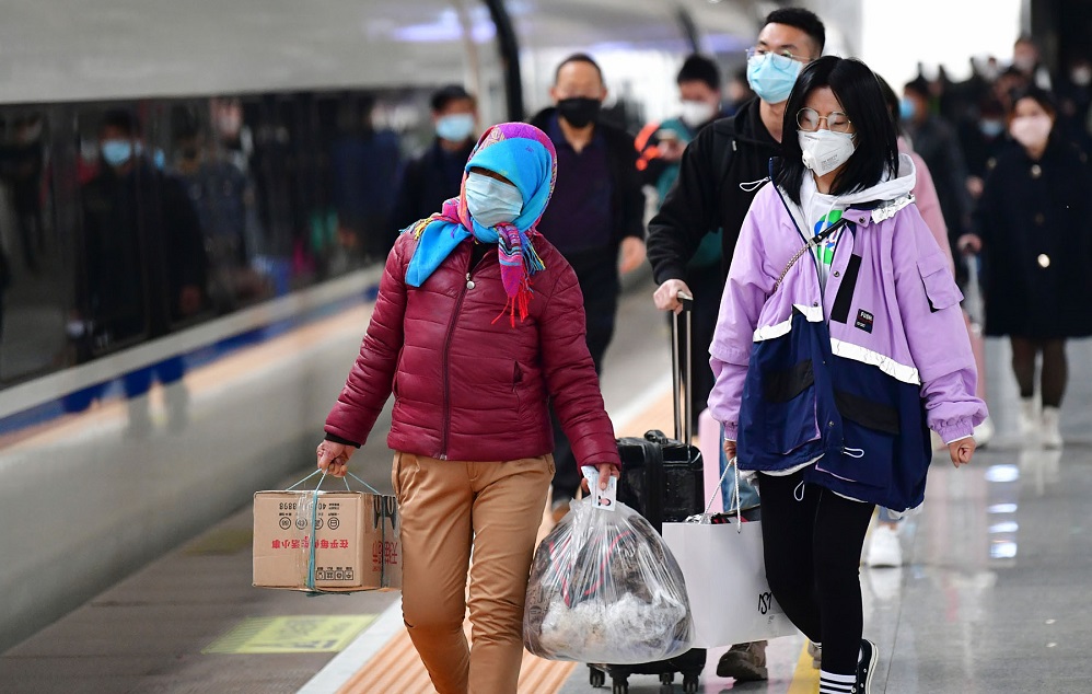 (200401) — LANZHOU, April 1, 2020 (Xinhua) — Passengers prepare to board a train for Guangzhou at Lanzhou West Railway Station in Lanzhou, northwest China’s Gansu Province, April 1, 2020. Train service from Lanzhou to Guangzhou, Shanghai, Wuhan and Urumqi gradually resumed with rigid coronavirus prevention measures. (Xinhua/Chen Bin)