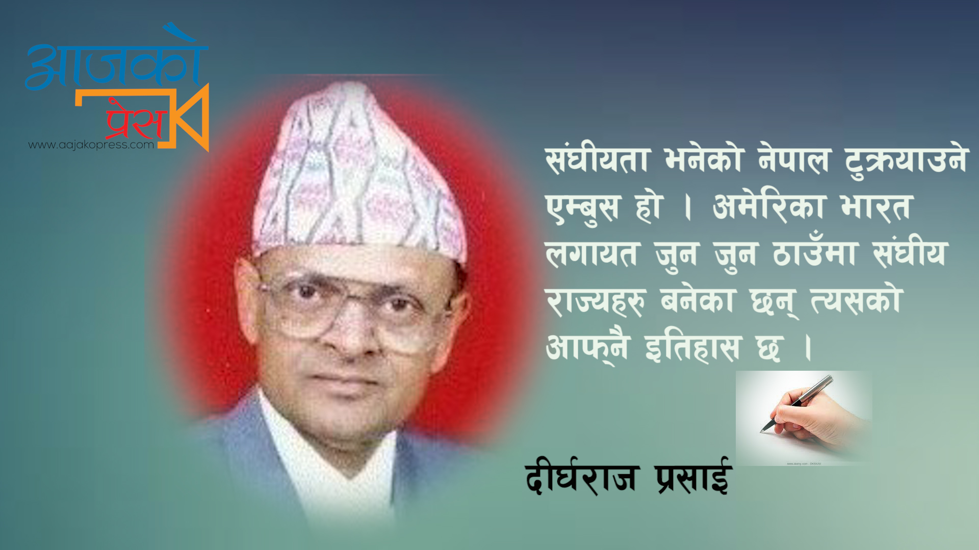 विदेशीहरुले नेपालका पार्टीका पदलोलुप्त नेताहरुलाई प्रयोग गरेर युगयुगदेखि पारस्पारिक सद्भावकासाथ मिलेर बसेका विभिन्न जात–जातिका नेपाली जनताहरु बीचको एकतालाई टुटाएर संघीयताको खतरनाक अवधारणाबाट नेपाललाई भौडिमा हाल्न चाहेका छन् । संघीयता भनेको नेपाल टुक्रयाउने एम्बुस हो । अमेरिका भारत लगायत जुन जुन ठाउँमा संघीय राज्यहरु बनेका छन् त्यसको आफ्नै इतिहास छ ।