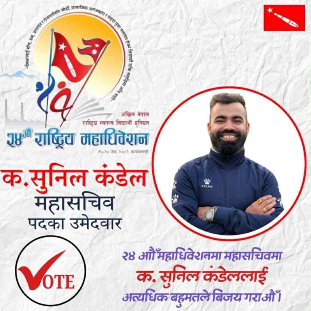 अनेरास्ववियुको २४ औं महाधिवेशनमा धादिङ्गका उदयमान सक्रिय युवा नेता सुनिल कडेलले महासचिव पदमा उम्मेदवारी दिएका छन्। लामो समय त्रिचन्द्र कलेजको उपाध्यक्ष रहि अध्यक्ष हुँदै अनेरास्ववियु २३ औं महादिवेशनबाट केन्द्रिय सदस्य बनेका कडेलको उम्मेद्धारीले उनीप्रति विद्यार्थी युवा माझ लोकप्रियता झनै बढेको देखिएको छ ।