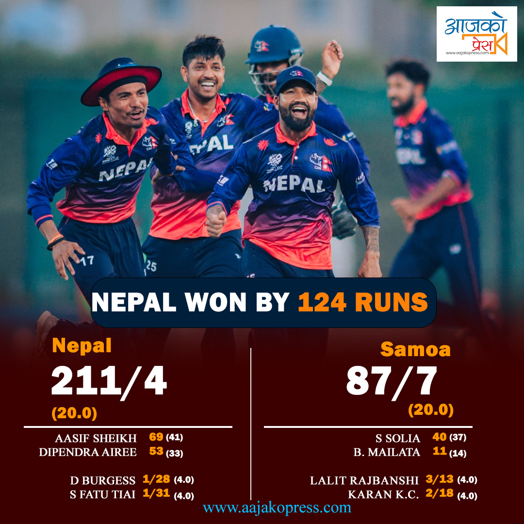 नेपालले दिएको २१२ रनको विशाल लक्ष्य पछ्याएको सामोआले २० ओभरमा ७ विकेट गुमाएर ८७ रन मात्र बनायो । सिन सोलियाले सर्वाधिक ४० रन बनाए ।